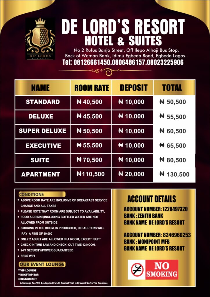 De Lords’ Resort Hotels and Suite is a tranquil oasis in the vibrant energy of Lagos mainland. With unparalleled comfort, sophisticated style, and impeccable service, we invite you to experience a world of elegance.